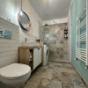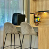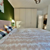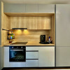Bucătărie modernă cu insulă și 2 scaune, complet echipată: plită cu inducție, hotă, cuptor electric, frigider, plus alimentări pentru electrocasnice (espressor, cuptor cu microunde etc.)